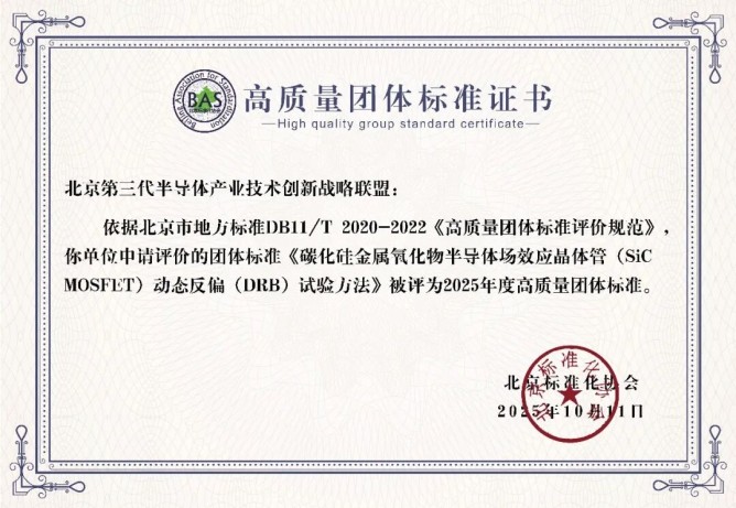 第三代半導(dǎo)體產(chǎn)業(yè)技術(shù)創(chuàng)新戰(zhàn)略聯(lián)盟發(fā)布的T/CASAS 046—2024《碳化硅金屬氧化物半導(dǎo)體場(chǎng)效應(yīng)晶體管(SiC MOSFET)動(dòng)態(tài)反偏(DRB)試驗(yàn)方法》團(tuán)體標(biāo)準(zhǔn),被評(píng)為2025年度高質(zhì)量團(tuán)體標(biāo)準(zhǔn)。